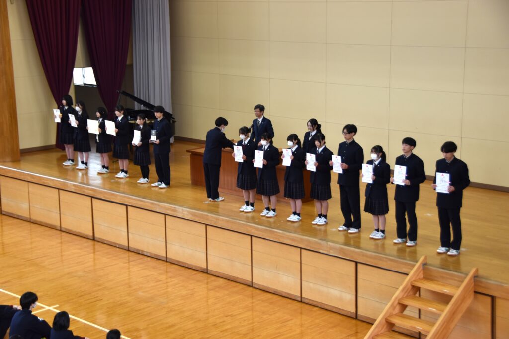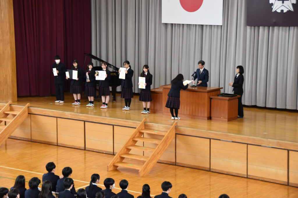 終業式に先立ち、部活動等の賞状伝達を行いました。高校では書道部 第34回国際高校生選抜書展(書の甲子園)入選の加藤奏来(かとう そら)さん・関根幸花(せきね ゆか)さん、放送部 第22回北信越高等学校選抜放送大会アナウンス部門 優良賞の倉嶋千咲(くらしま ちさき)さん・朗読部門 優良賞は代表者の片山瑞葉(かたやま みずは)さん、生物部 第13回北信越地区高等学校自然科学部研究発表会 優秀賞は代表者の小林深礼(こばやし みれい)さん、第69回日本学生科学賞入選 は代表の斎藤蘭真(さいとう らんま)さん、陸上競技部 令和7年度 全国高等学校体育連盟陸上競技部 等級記録到達者として、女子4×400mR特級の中俣日乃(なかまた ひの)さん、同1級の細川芽愛(ほそかわ めい)さん・山口紗英(やまぐち さえ)さん、同2級の齋藤楓菜(さいとう ふうな)さん、女子100m1級の田村美桜(たむら みお)さん、男子110mH1級の登石愛輝(といし あいる)さん、男子4×100mR2級の中澤拓哉(なかざわ たくや)さん・加藤滉太(かとう こうた)さん・曾山蒼生(そやま そうき)さんに賞状が伝達されました。