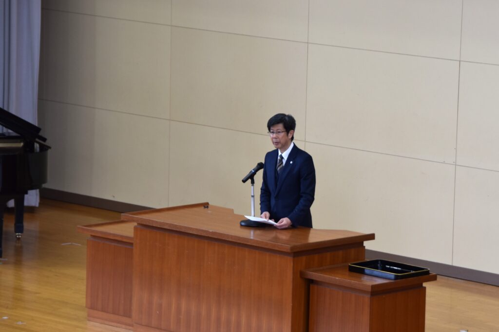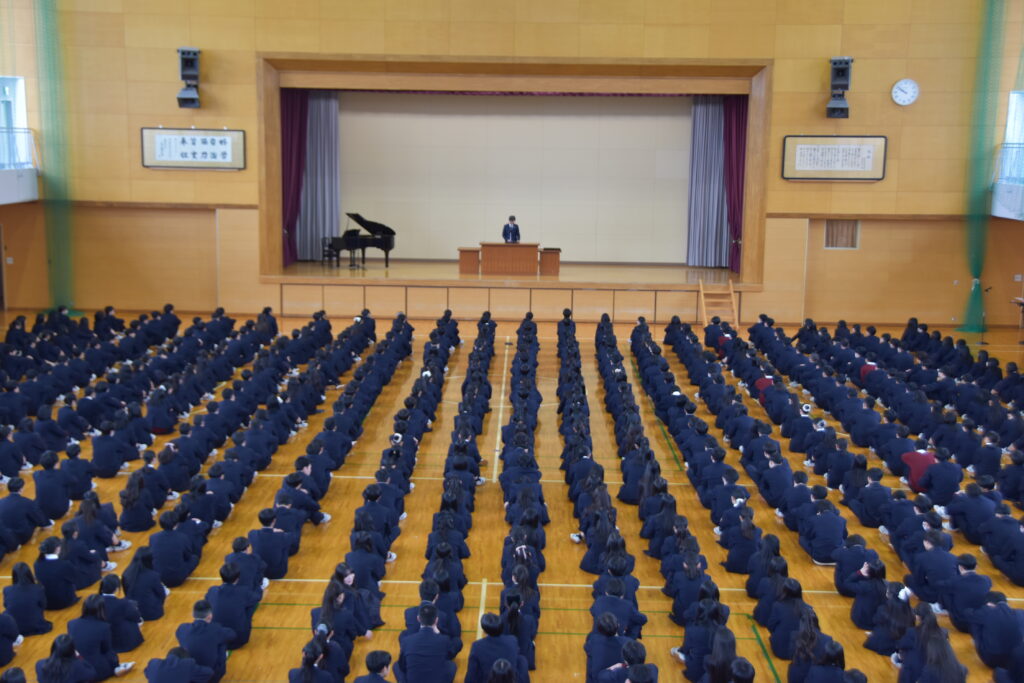 校歌斉唱の後、長谷川校長から「一年の振り返りの時期です。この一年の学習が、自分のための勉強になっていたか、振り返って欲しい。予習・復習を行い、関連付けたり理由付けたりの学習をするなど、しっかりと身につく勉強をすることが大切である。高いレベルでの両立をめざす具体的な方法を自分で考えてみて、次年度に活かしてほしい。また、稲盛和夫さんの『思いは必ず実現する、思いは必ず行動にあらわれ、実現につながる。』を引き合いに出され、将来への夢・希望・志を大切にしてほしい。4月には新入生が入って来ます、新入生・後輩の見本となるよう、春休みにいろいろと考えてみよう。」とのメッセージがありました。